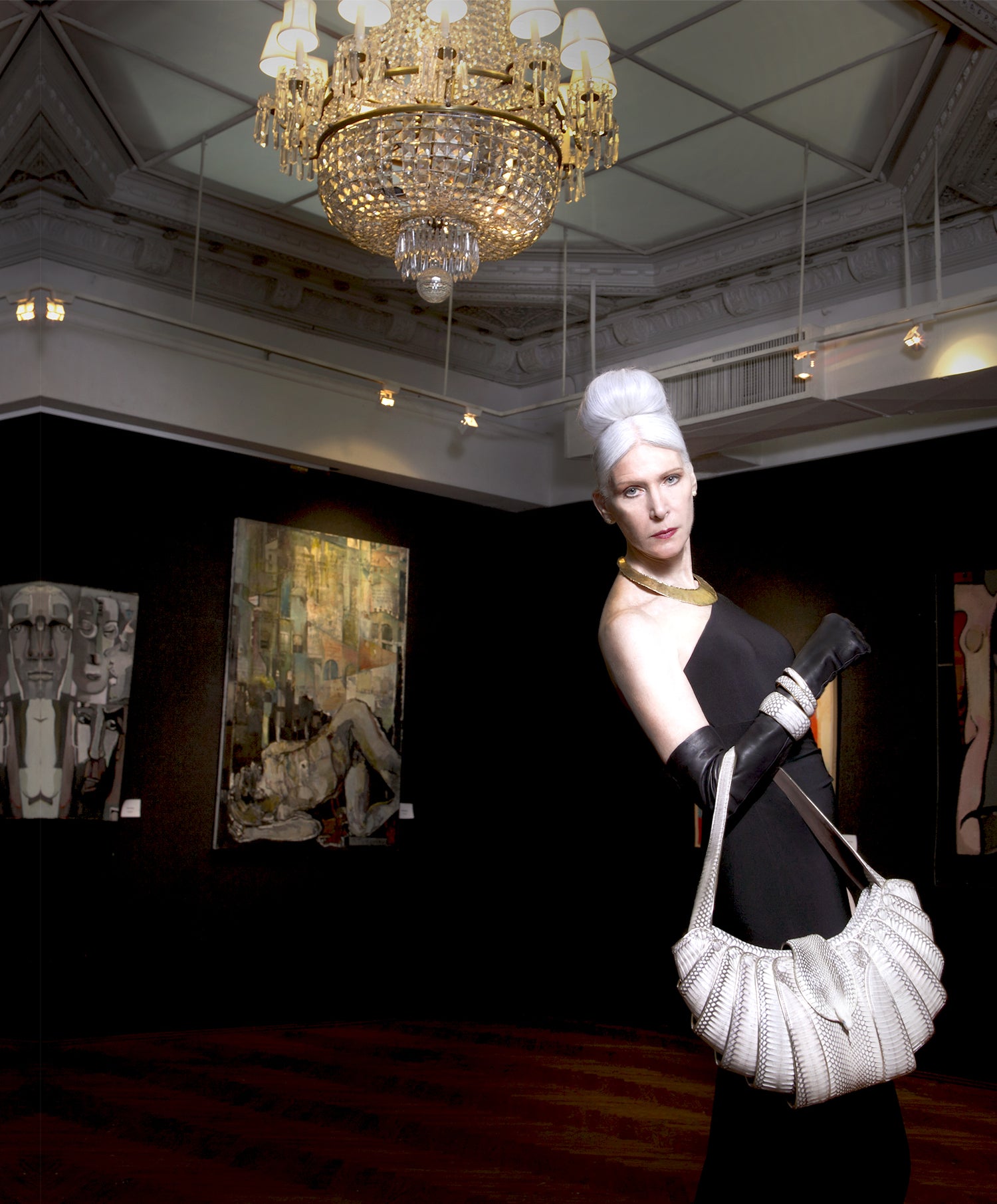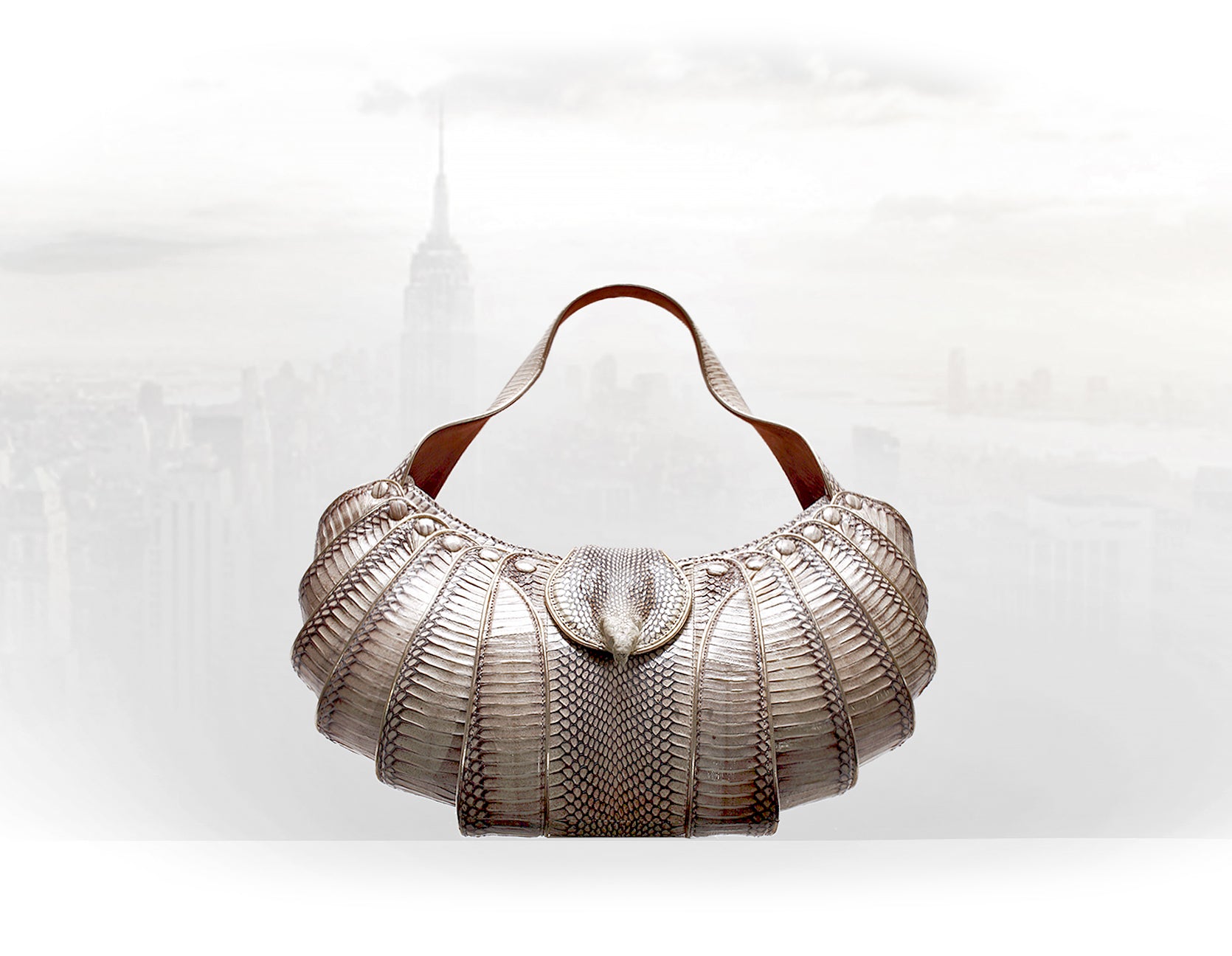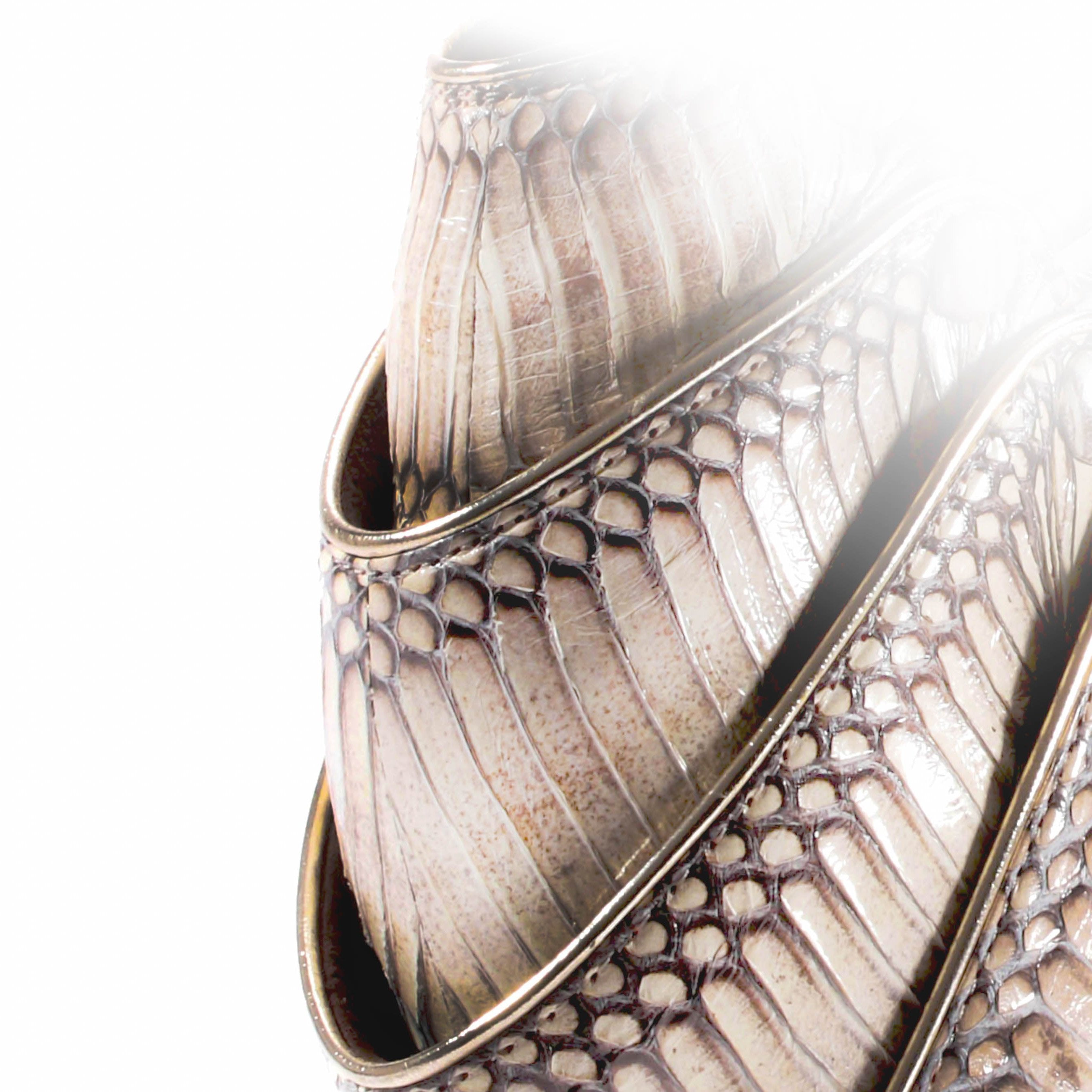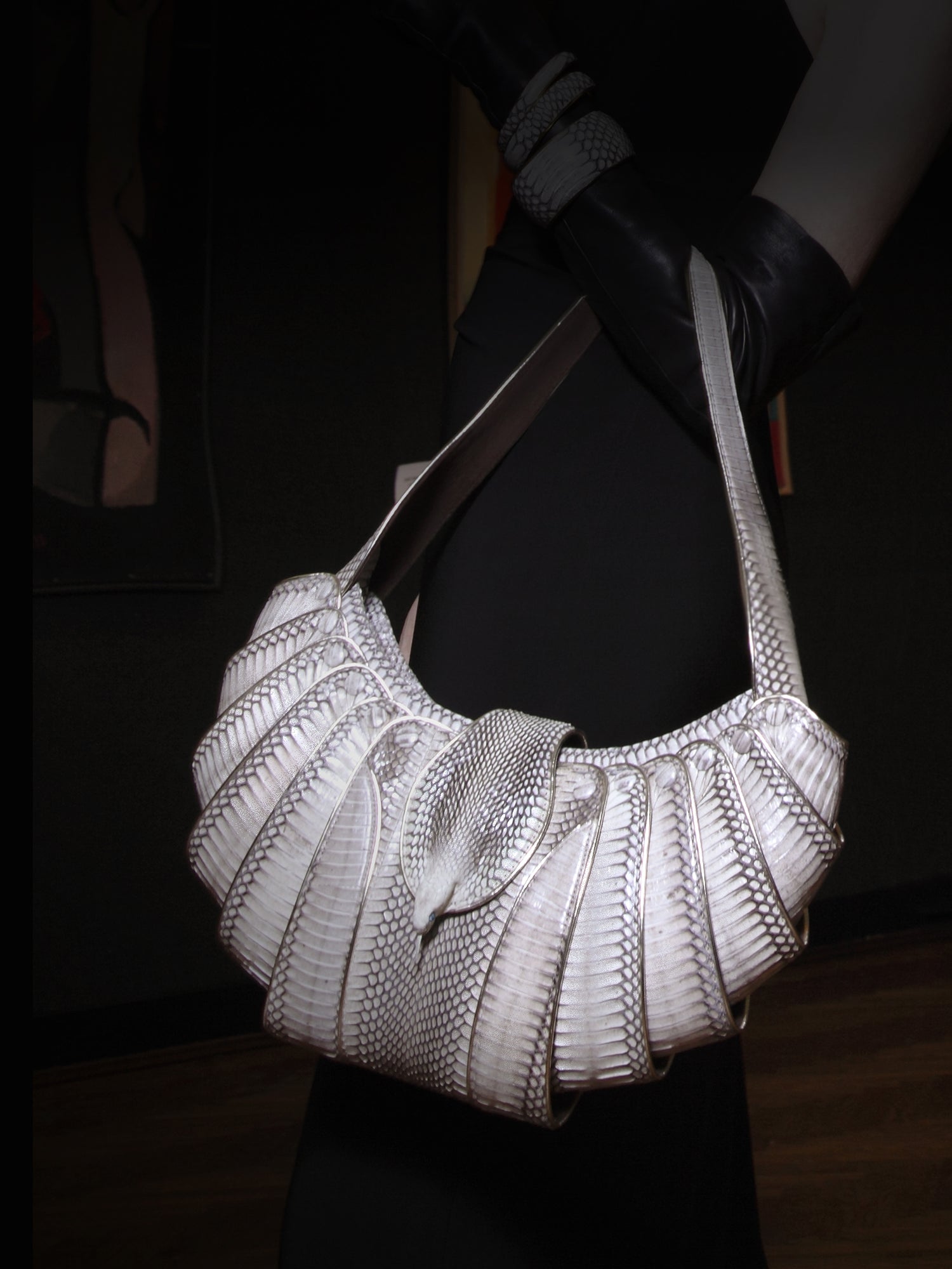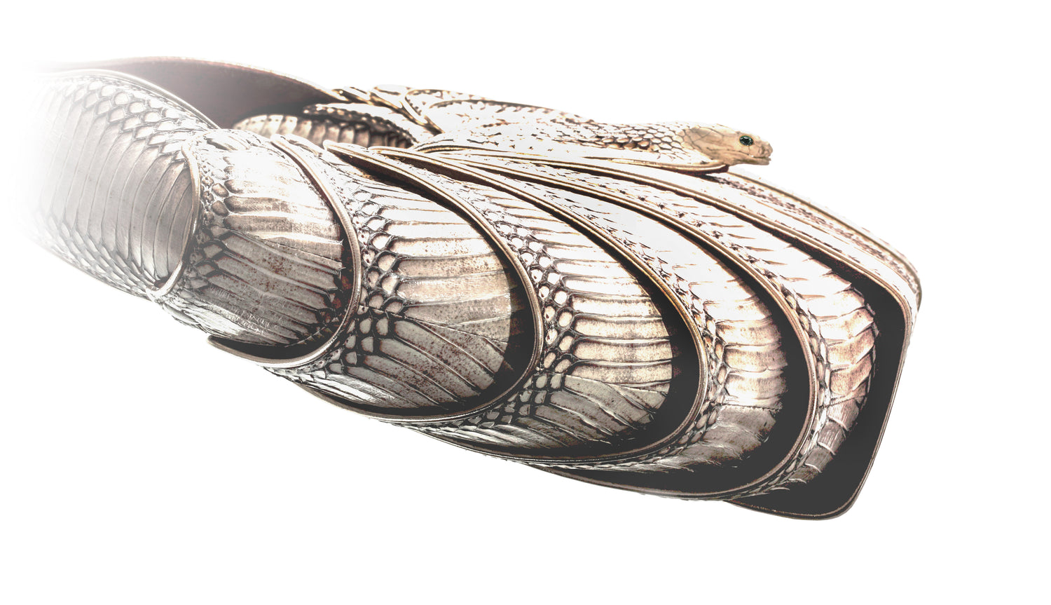 To enhance the visual impact of this haute accessory, 120 hand cut pieces of cobra hide and 45 feet of platinum calf skin piping where used, producing a unique jewel like effect. Brilliant cut precious gems are set in a cabochon setting to mimic the reptilian eyes.
